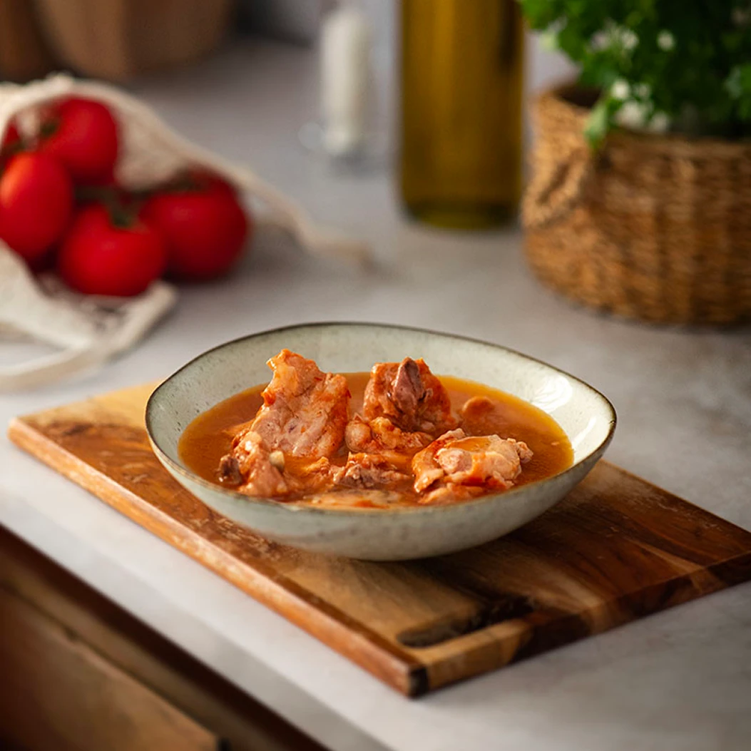 Descubre el sabor de nuestro pollo cocinado con tomate y especias, un clásico que nunca falla para salvarte de cualquier apuro.